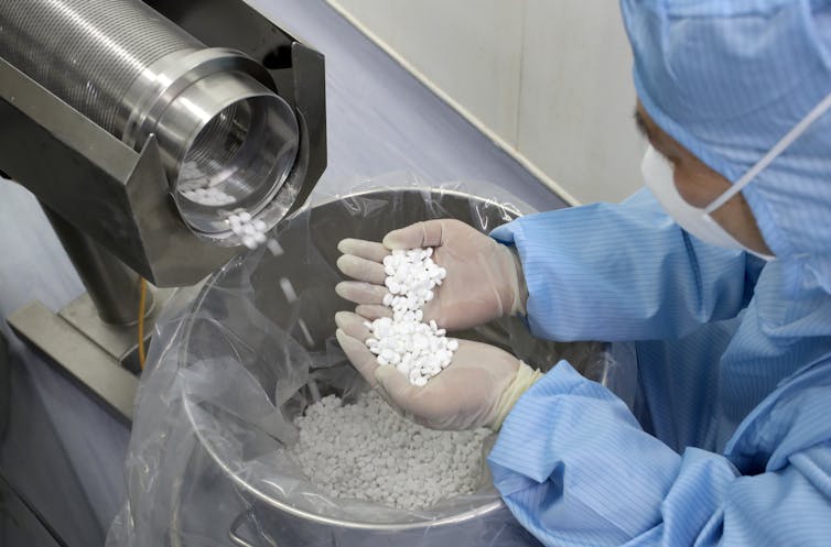 | An employee in Nantong, China, checks the production of chloroquine phosphate, an old drug for the treatment of malaria. Feature China/Barcroft Media via Getty Images |