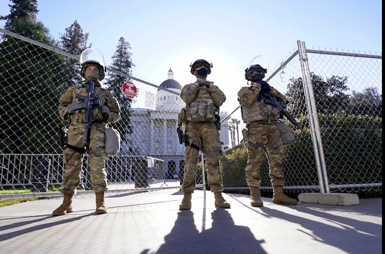 | The Second Amendment declares the importance of state-government authorized militias, like these National Guard troops guarding the California State Capitol building. AP Photo/Rich Pedroncelli |