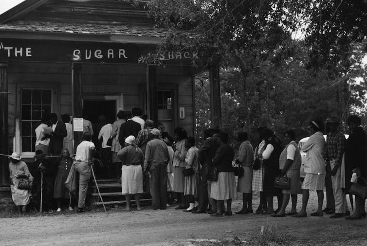 | A group of voters lining up outside the polling station, a small Sugar Shack store, on May 3, 1966, in Peachtree, Ala., after the Voting Rights Act was passed the previous year. MPI/Getty Images |