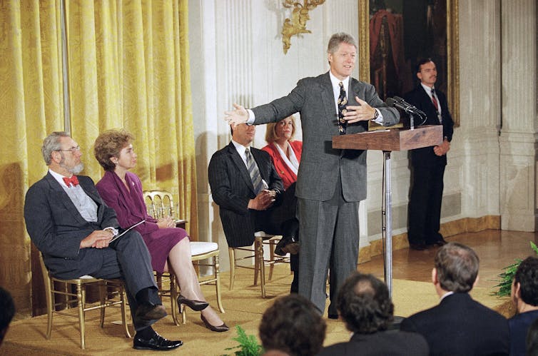 | Bill Clinton’s 1993 health care plan called for universal coverage. It was dead by 1994, but the political wrangling it started over health care lives on. J. Scott Applewhite/AP Photo |