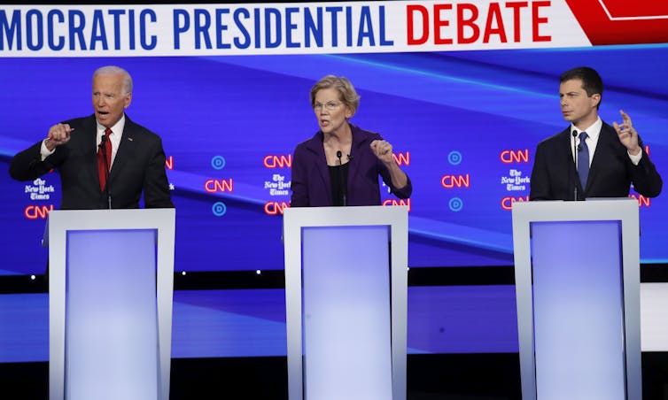 | Joe Biden, Elizabeth Warren and Pete Buttigeig at the Oct. 15, 2019 debate at Otterbein University in Westerville, Ohio. John Minchillo/AP Photo |