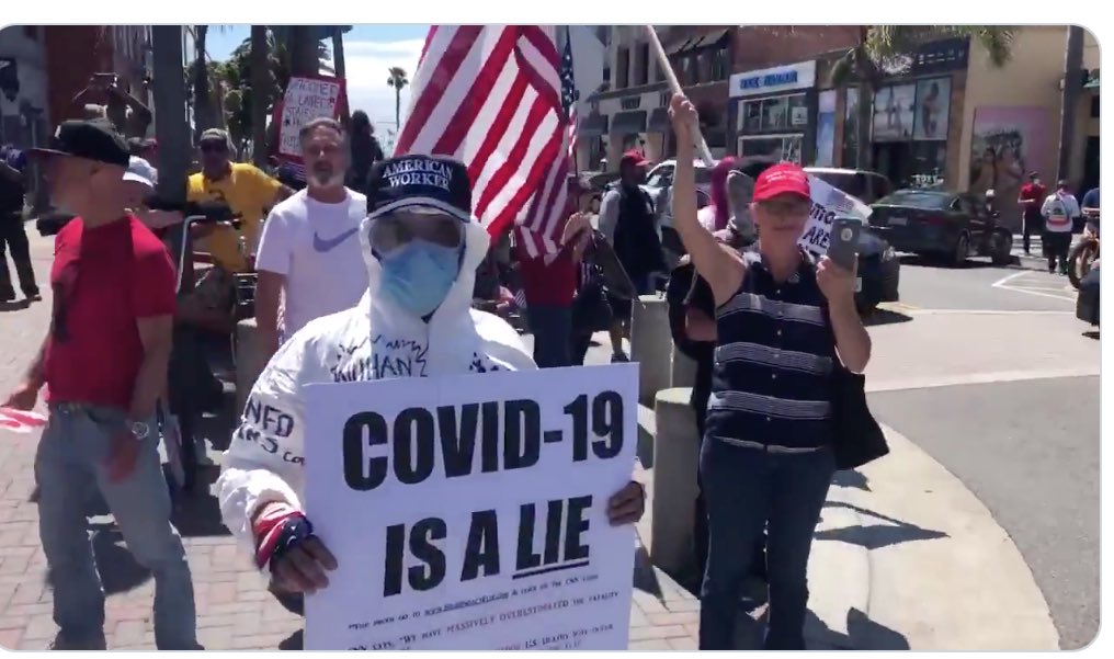 | Trump is trying to stir up his supporters to protest state social distancing policies. Here's one of them who seems to be hedging his bets. |
