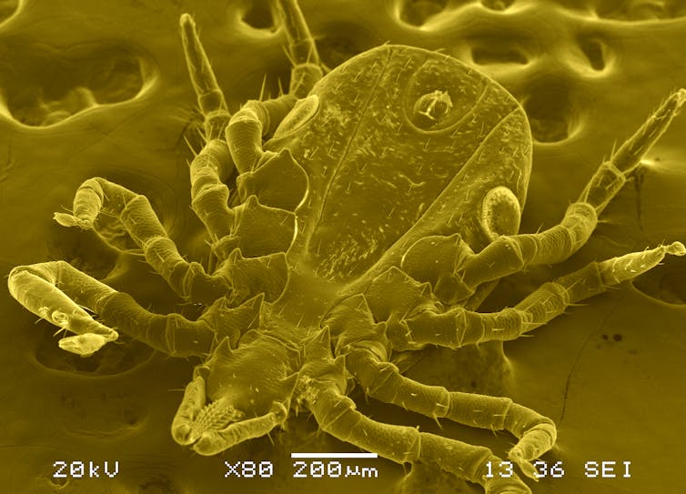 | Ticks like this one, shown magnified with an electron microscope, can transmit bacteria that cause severe illnesses in humans. Fernando Otalora-Luna/University of Richmond, CC BY-SA |