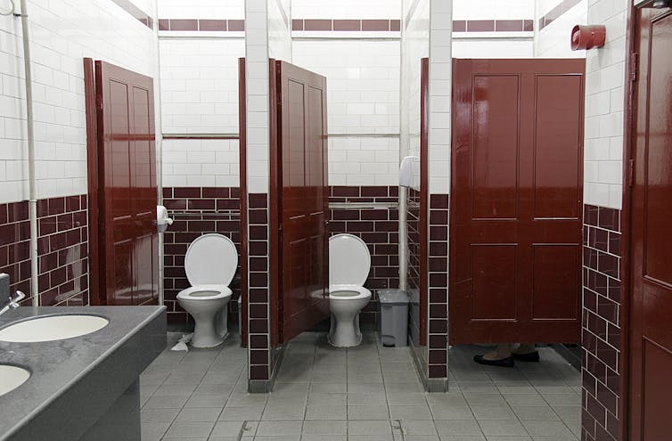 The air in an enclosed space like a public restroom can have coronavirus particles in it for several hours after someone infectious with COVID-19 was there.