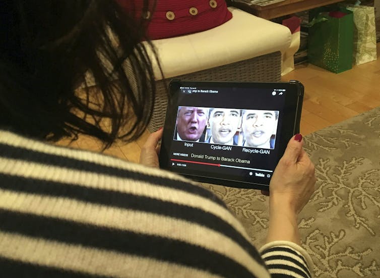 | A woman views a manipulated video that changes what is said by Donald Trump and former President Barack Obama. ROB LEVER/AFP via Getty Images |
