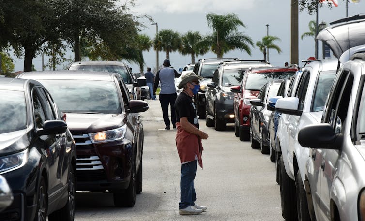 | Residents line up in their cars in late November at a food distribution site in Clermont, Florida, where many are hungry because of the pandemic. Paul Hennessy/SOPA Images/LightRocket via Getty Images |