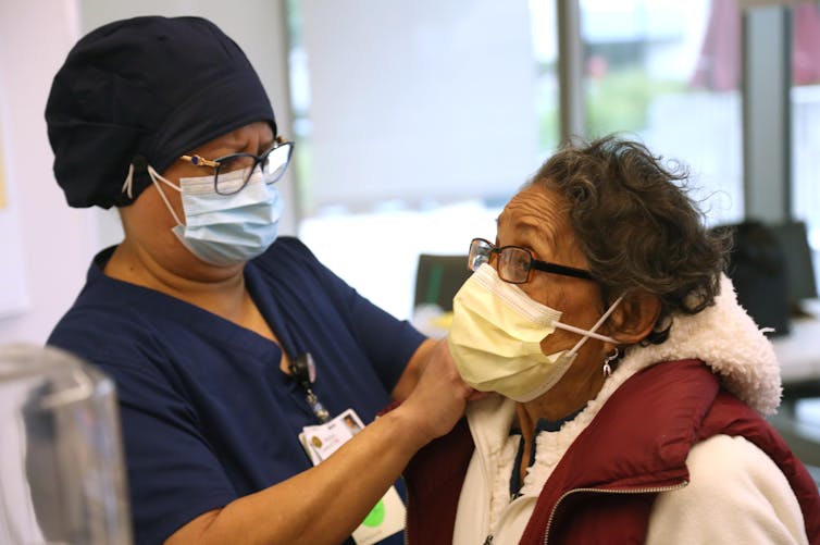 | Maria Saravia, a worker at the University of Southern California’s Keck Hospital, adjusts her mother’s mask before her COVID-19 vaccination. Genaro Molina/Los Angeles Times via Getty Images |