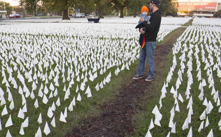 | A November 2020 memorial in Washington, D.C. consisted of thousands of flags, each planted to remember someone who died of COVID-19. Andrew Lichtenstein/Corbis via Getty Images |