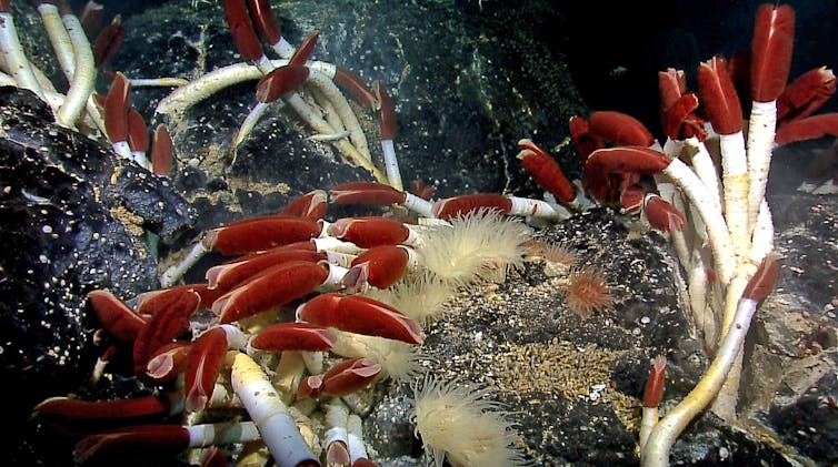 Tube worms, anemones and mussels clustered near a hydrothermal