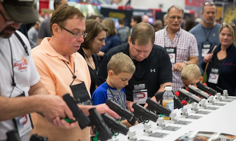 | NRA conventiongoers, like these at the gun group’s 2018 big meeting, browse firearms exhibits. Loren Elliott/AFP via Getty Images |