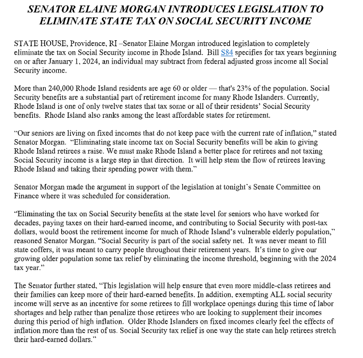 Charlestown state Senator Elaine Morgan issued a news release to mark her introduction of new legislation to eliminate the state's income tax on ALL Social Security income. In her statement, she notes the economic plight of seniors and claims her bill will "be akin to giving Rhode Island retirees a raise."Except that's a lie.