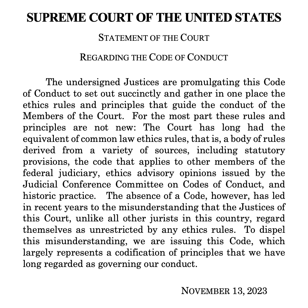 A statement released by the court on Monday accompanying the code said it was formulated to dispel “the misunderstanding that the Justices of this Court, unlike all other jurists in this country, regard themselves as unrestricted by any ethics rules.” It said the code “largely represents a codification of principles that we have long regarded as governing our conduct.”