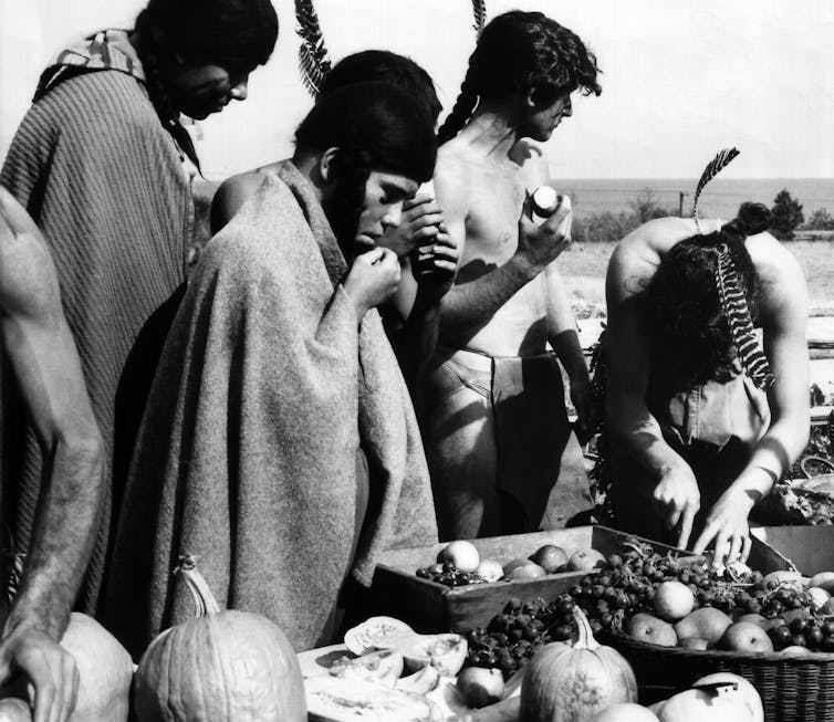 | Native Americans depicted at the first Thanksgiving feast, in a 1960 film about the Pilgrims’ first year in America. AP Photo |