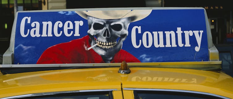 | A “Cancer Country” sign on a taxi parodies a famous Marlboro ad campaign. Viviane Moos/Corbis via Getty Images |
