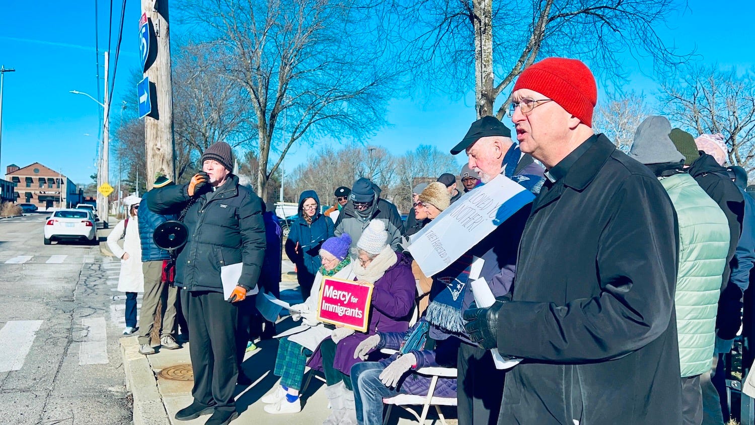 “We gather here today to pray for an end to the violence of mass deportations of our migrating brothers and sisters, which include practices of racial profiling, the separation of families, the deportation of people who are asking for asylum and safety from the conditions of their homelands, too often taken back to dangerous conditions without any criminal records to justify removal from our country and arbitrarily losing their legal status,” said Father Bob Mosher of the Bristol Columban Fathers, standing outside the Wyatt Detention Center in Central Falls yesterday. “Together with our bishops, we express concern for the conditions in detention centers like the Wyatt facility in front of us. We pray today, the Holy Rosary, meditating on the five holy migrations of our Lord Jesus Christ, aware that our Savior, whose birth we celebrate in a few days, also experienced the challenges and dangers of migration during his life on earth.